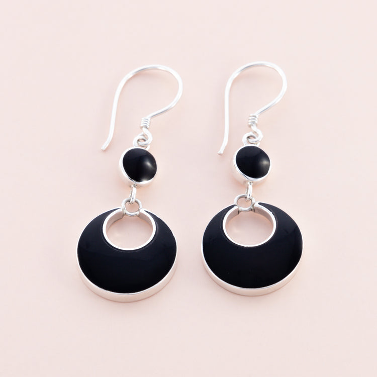 These black shell earrings are the perfect accessory to add a touch of elegance to any outfit. Made from sterling silver, they feature a striking design with two black shell circles. The shell adds a beautiful contrast to the silver, making these earrings truly eye-catching. These earrings are sure to make you stand out from the crowd.