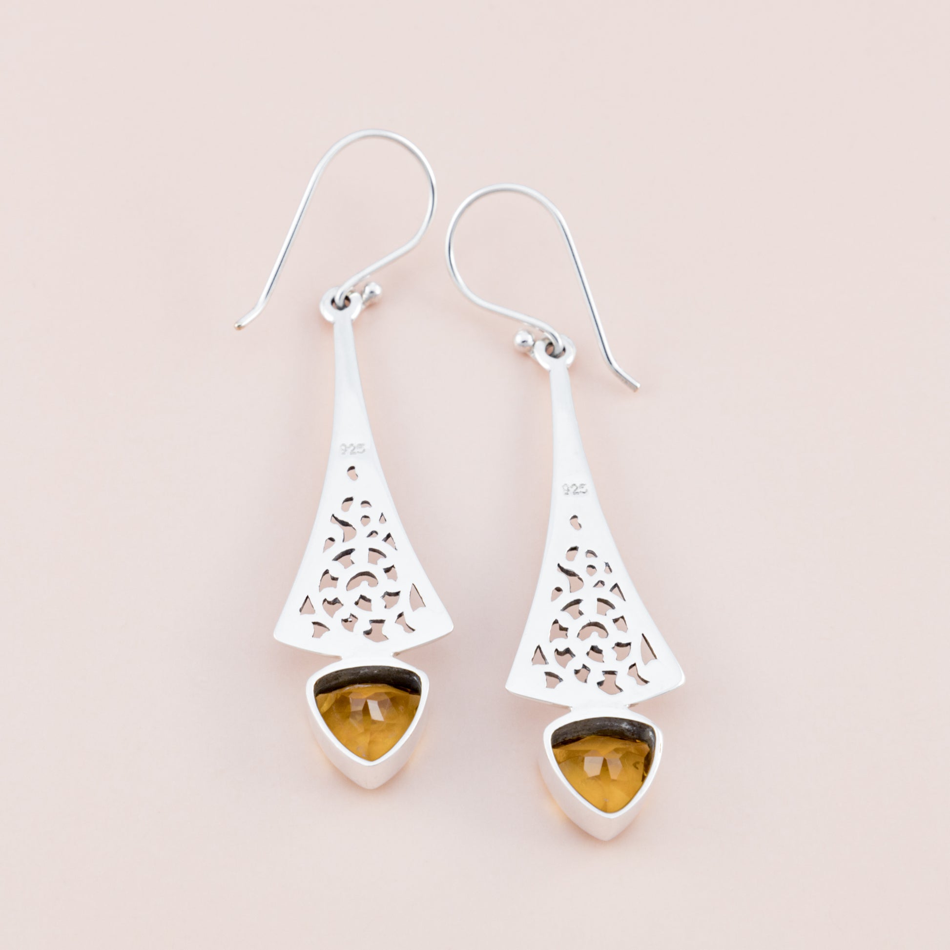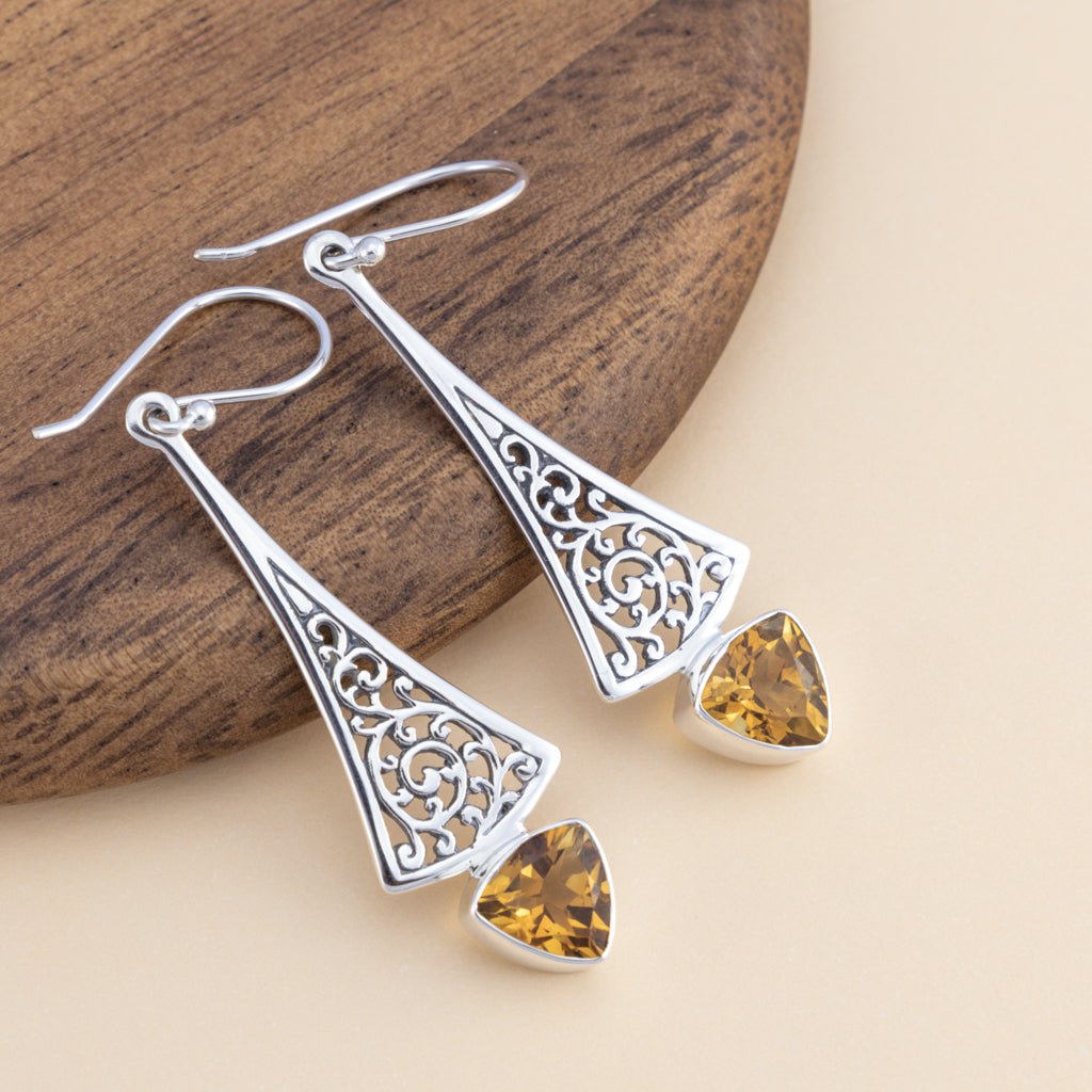 These citrine filigree drop earrings are a work of art. They're made with sterling silver and feature the citrine gemstone. The beautiful yellow stones sit below the intricately designed sterling silver. These earrings are sure to make a statement at whatever occasion you wear them. So go ahead and treat yourself - you deserve it.