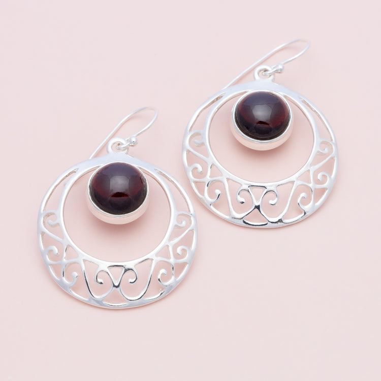 These garnet dangle earrings will be your new go-to pair. The intricate filigree design is made of sterling silver and adorned with the beautiful garnet gemstone. With a little bit of edge, these earrings are a statement piece whether you’re dressing up or dressing down.