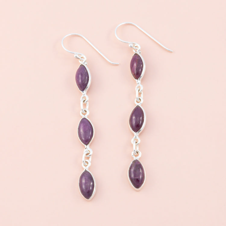 Elegant, beautiful and luxurious. These graceful earrings are destined to become your favourite. Set in sterling silver, they feature three gorgeous rubies in each earring and a beautiful drop design. They’re the perfect way to add a touch of style to your chosen look.