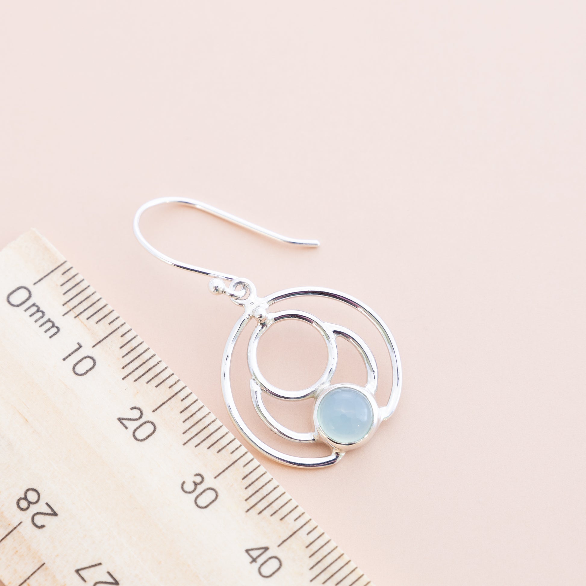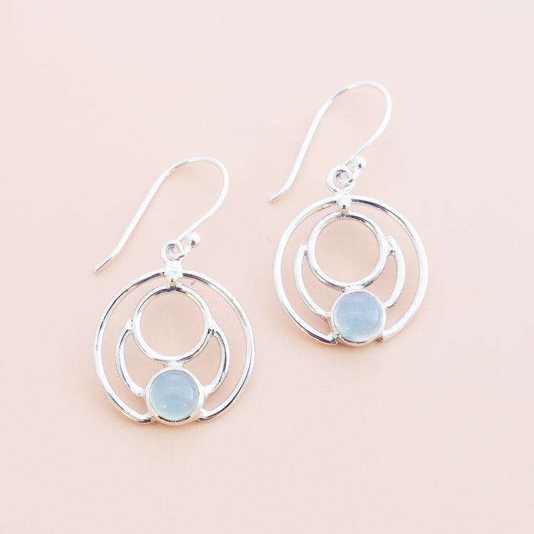 These simple statement earrings pack a punch of serenity and style. With solid spirals of sterling silver and a blue chalcedony gemstone set at the bottom, you'll feel a sense of calm wash over you. The soothing blue hue of the chalcedony gemstones brings a touch of peacefulness to your ensemble, while the swirling silver adds a hint of movement and elegance.