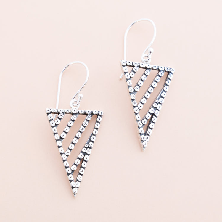 A downward facing triangle dangle with swirling dots? How else can we describe these unique sterling silver earrings? If you're after a pair of earrings that are a little bit different but casual enough to wear all the time, then these might just be for you.
